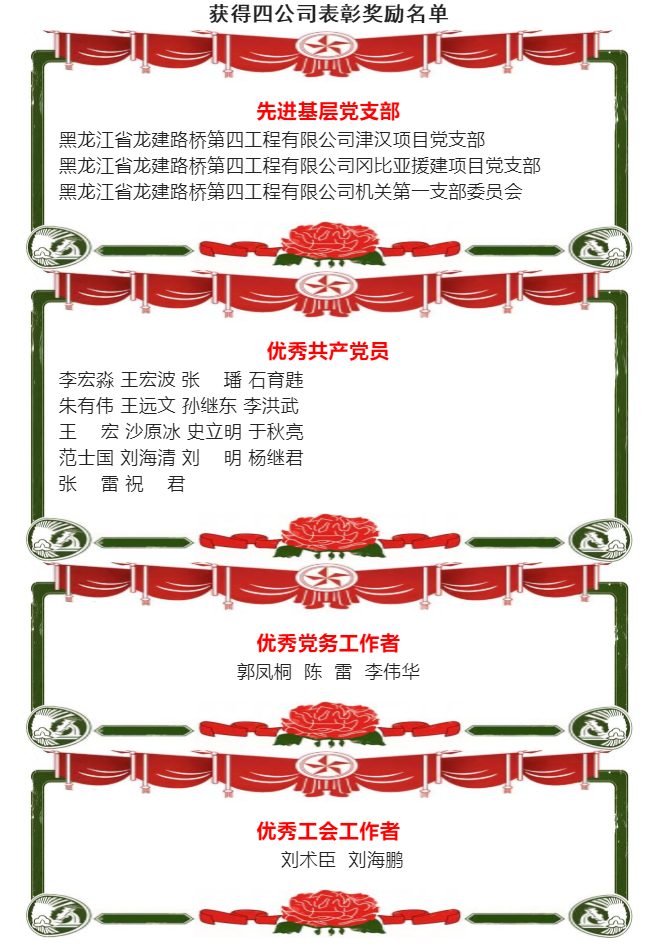 四公司共表彰先进基层党支部3个,优秀共产党员18名,优秀党务工作者3名,优秀工会工作者2名。会议由四公司领导班子成员为“先优”获奖者颁奖。